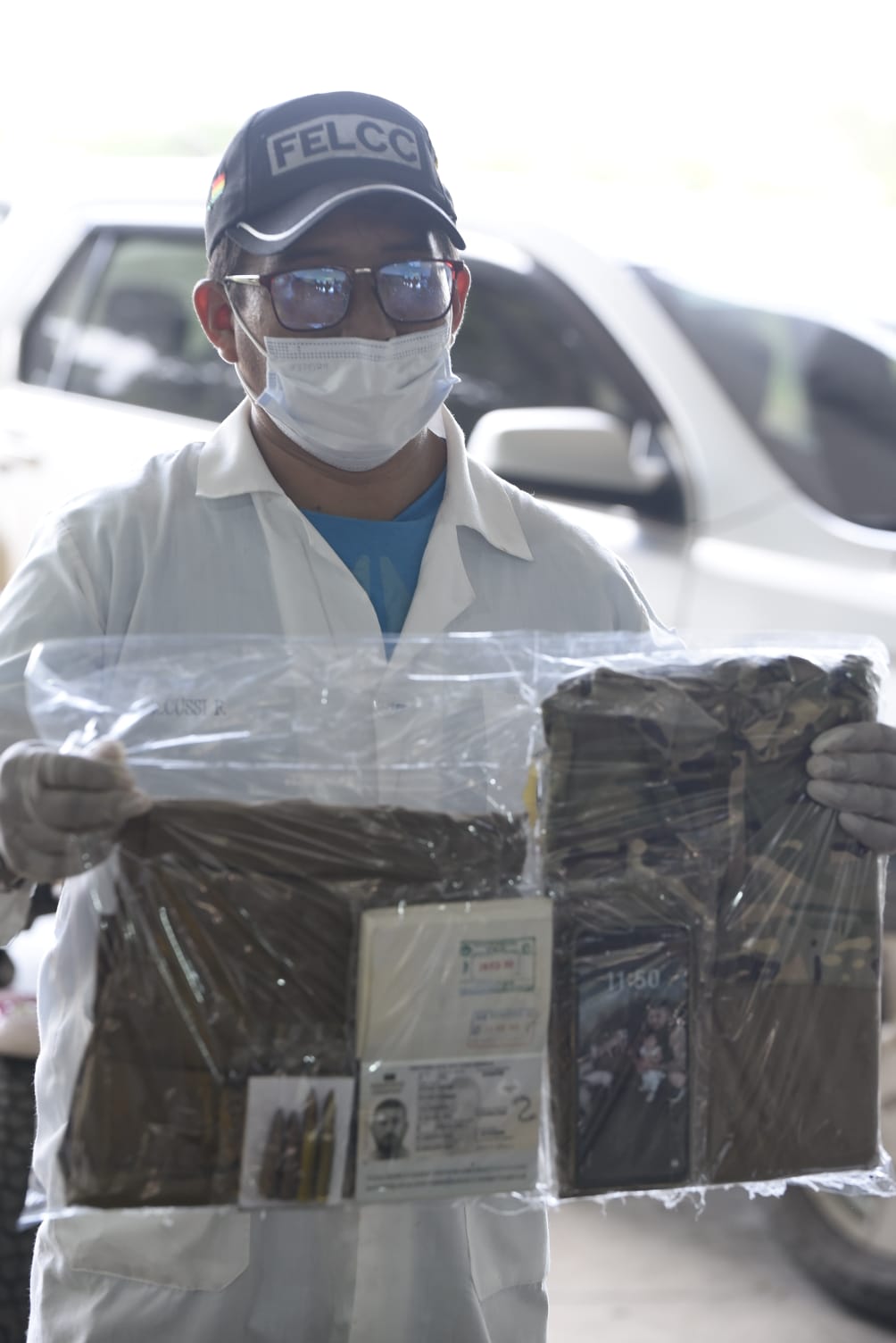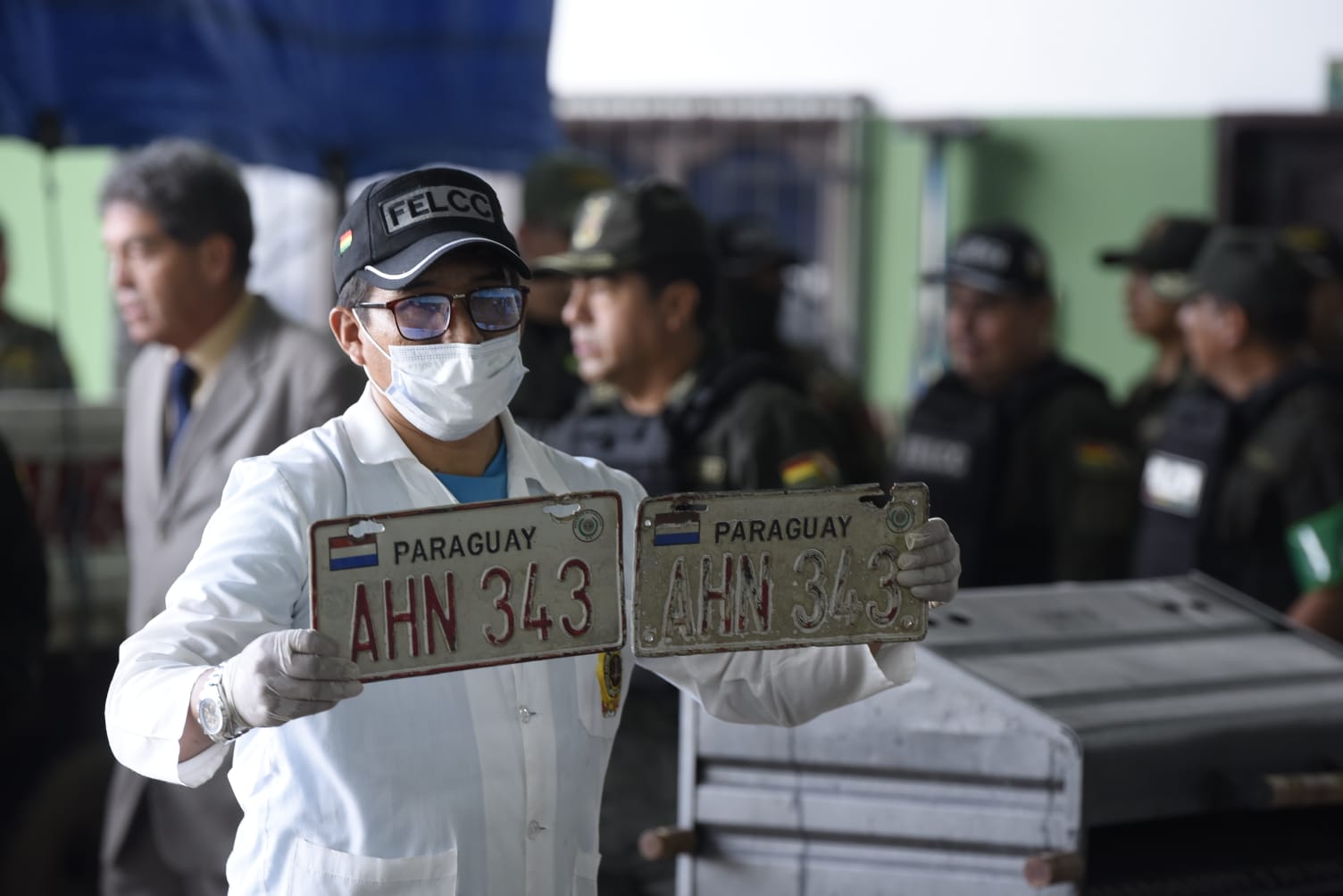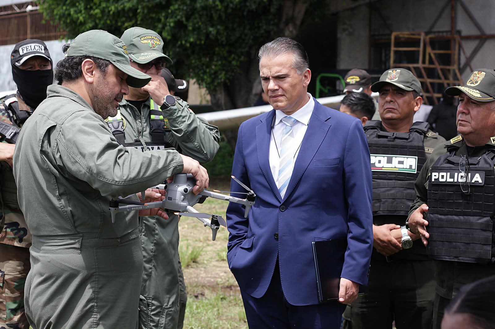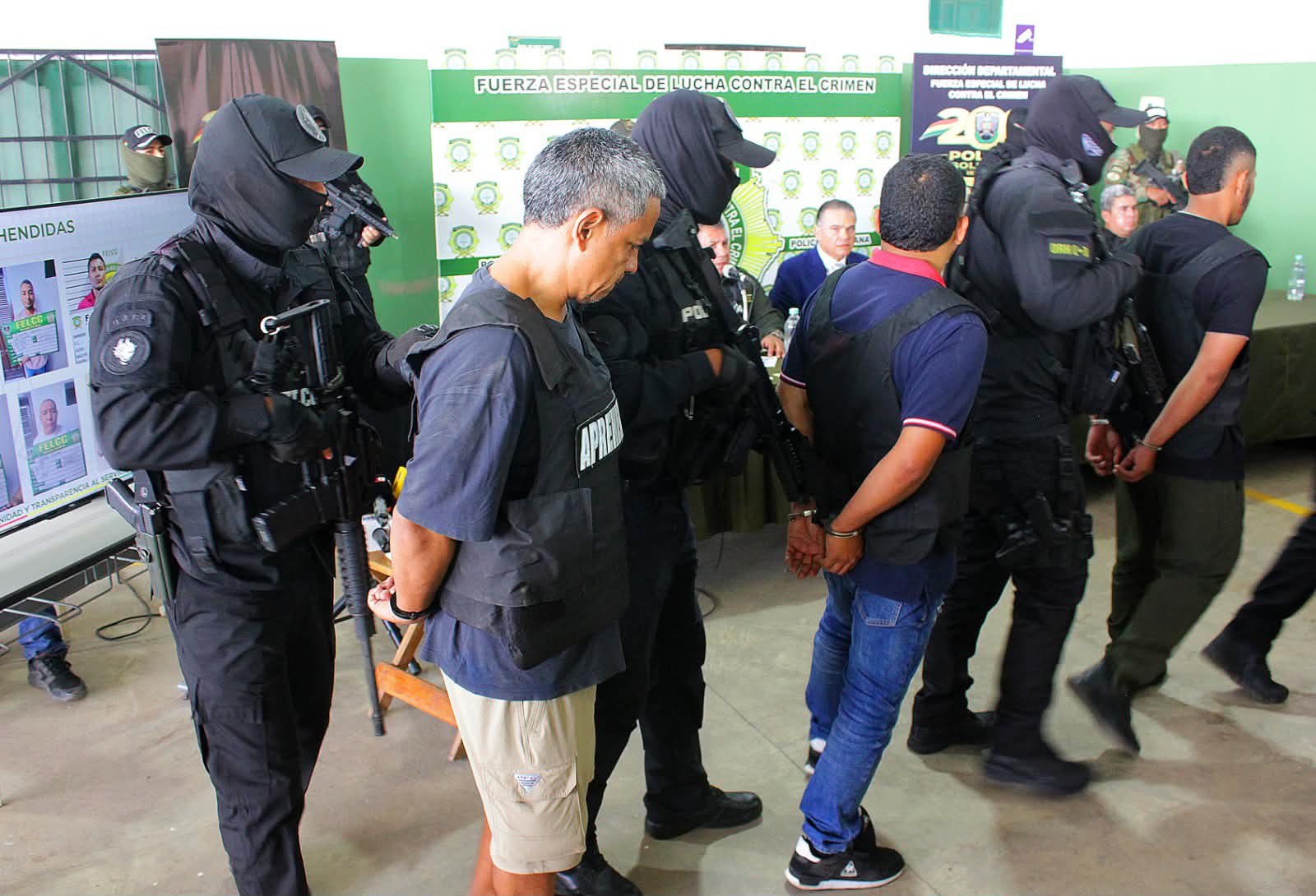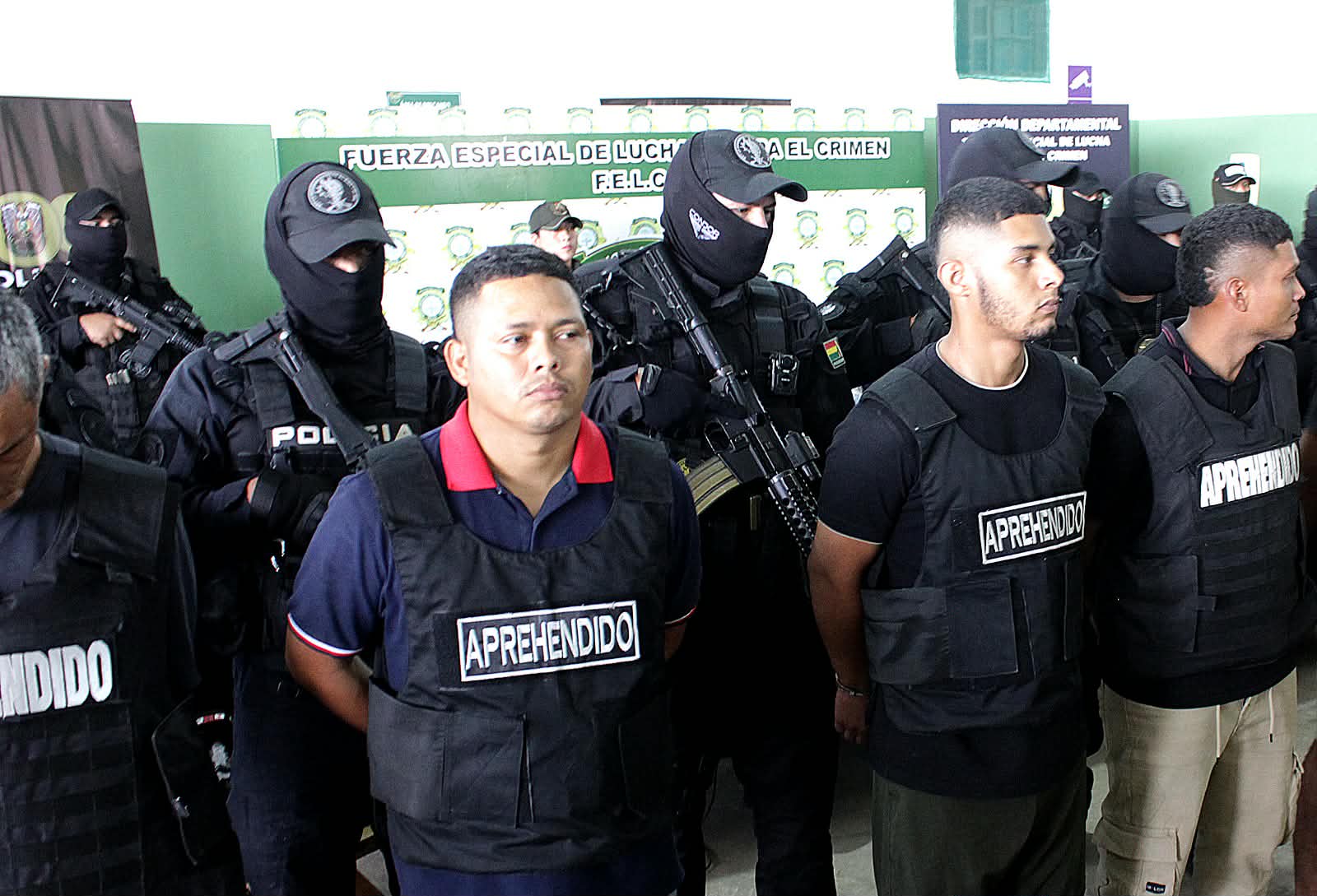 Zar antidrogas Ernesto Justiniano y el viceministro Hernán Paredes, presentaron a 12 aprehendidos que serían del cuerpo de seguridad del narco uruguayo. Un día antes allanaron la base de operaciones de Marset en Portachuelo. (Fotos: Regis Montero/APG)