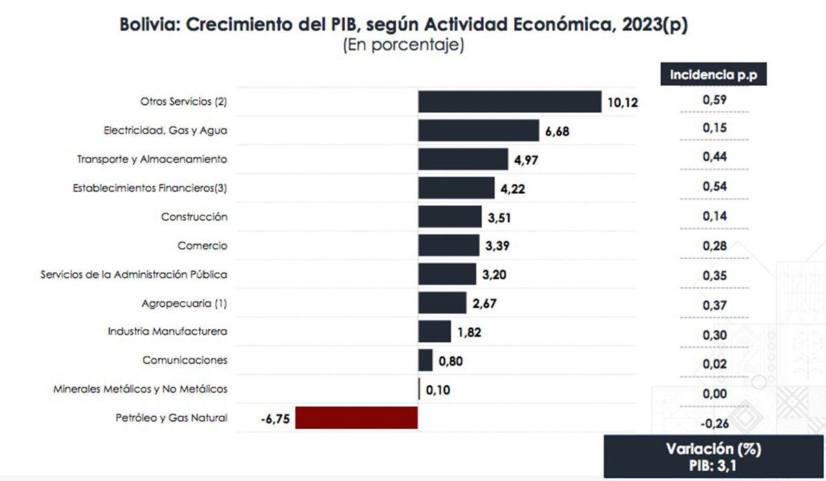 De las 12 actividades económicas que se evalúan, 11 registraron crecimiento el año pasado, pero hubo una contracción del sector de petróleo y gas de -6,75%. El rubro Otros servicios encabezó la expansión económica con un aumento de 10,1% y una incidencia de 0,59% en el PIB total, le siguió Electricidad, gas y agua con una subida de 6,6% y en tercer lugar se ubicó transporte y almacenamiento con 4,9%.