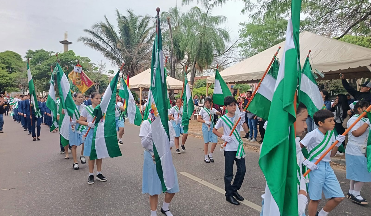 La Dirección Departamental de Educación abrió la agenda este lunes por la tarde con un desfile escolar en el Parque Urbano. Más de 70 unidades educativas, junto a institutos tecnológicos y centros de educación alternativa, participaron con trajes típicos y representaciones culturales.