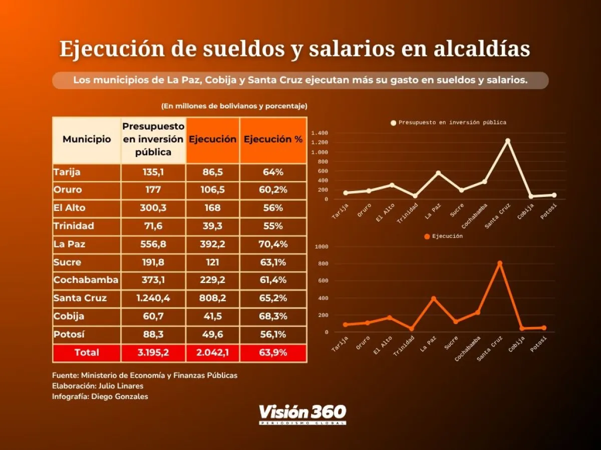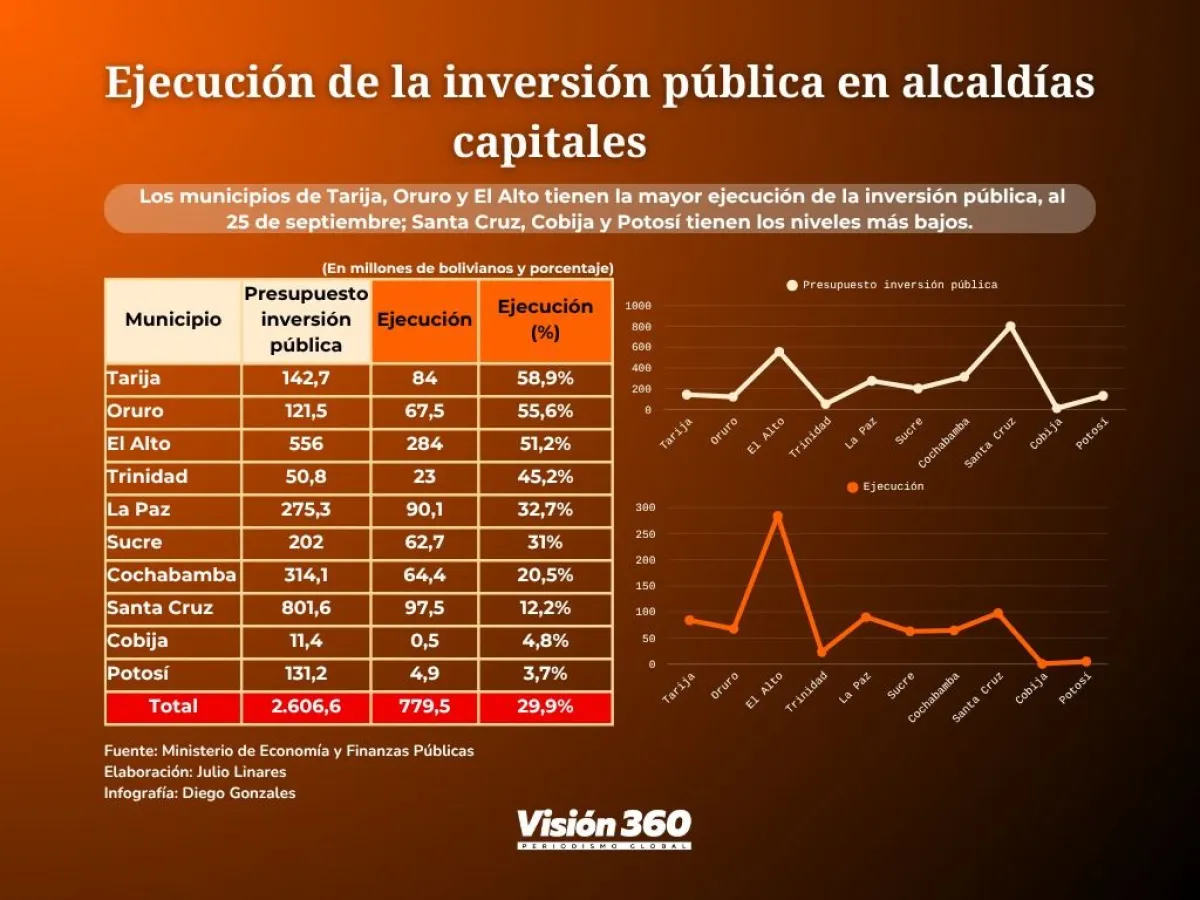 Hasta el 25 de septiembre, las alcaldías de Tarija, Oruro y El Alto presentan la mayor ejecución de la inversión pública programada para el año, mientras que las de Santa Cruz, Cobija y Potosí tienen el peor desempeño, según datos del Ministerio de Economía, analizados por el economista Julio Linares.