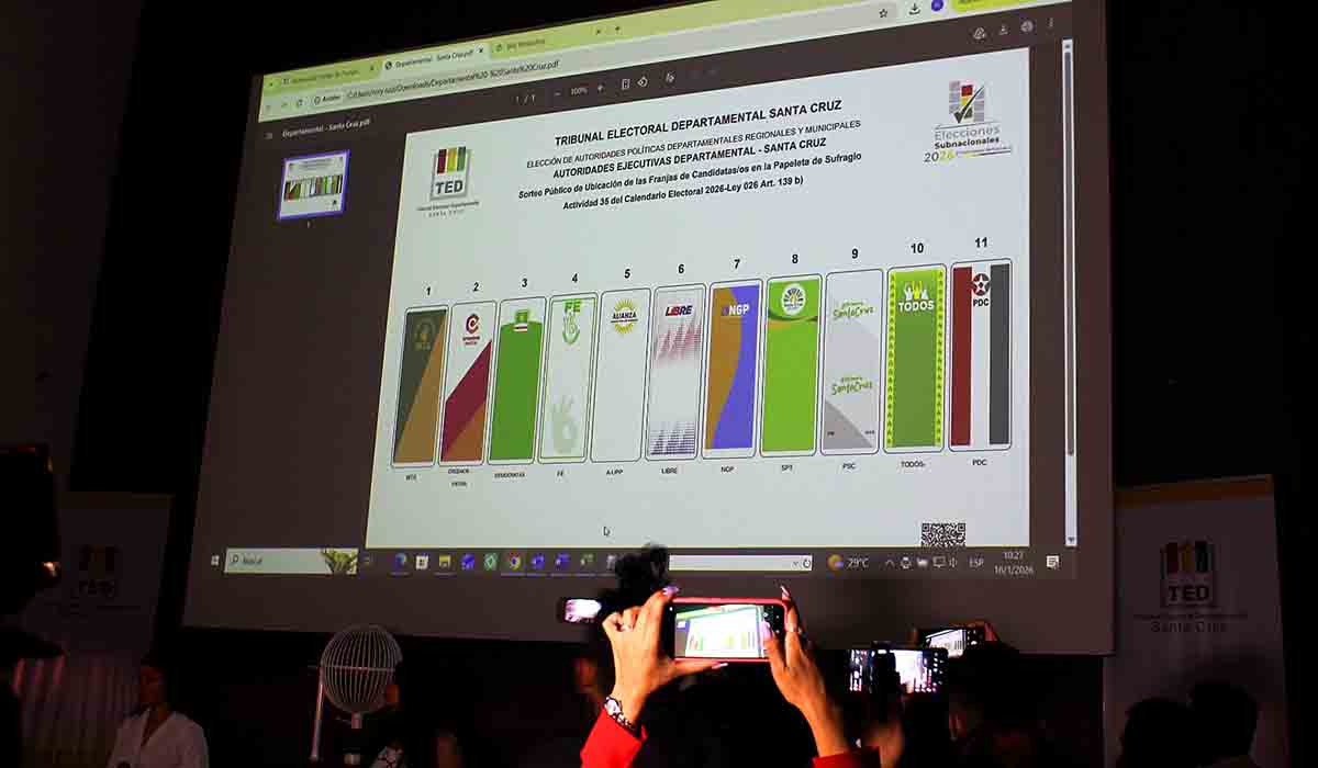 Para la Gobernación de Santa Cruz quedaron once frentes en carrera, tras la inhabilitación de Acción Democrática Nacionalista (ADN), que por esta razón no fue tomada en cuenta en el sorteo. De izquierda a derecha quedaron ubicados así: MTS, Creemos, Demócratas, FE, AUPP, Libre, NGP, SPT, PSC, Todos y PDC.