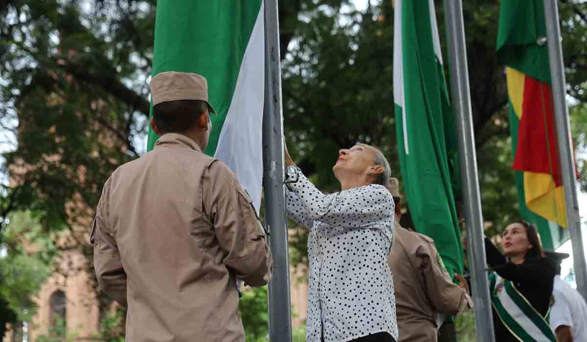 Por su parte Sarita Mansilla, secretaria de Cultura y Turismo del municipio, encabezó la iza de la bandera cruceña en la plaza principal 24 de Septiembre.