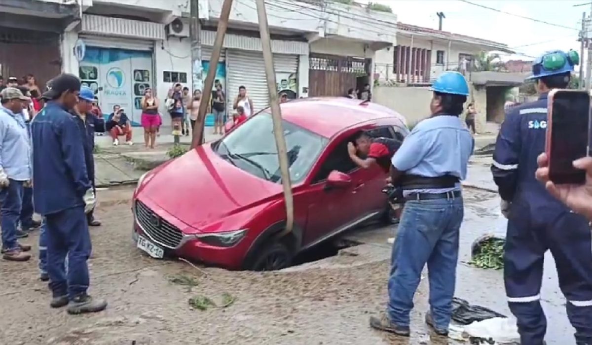 La mañana de este viernes 13 de marzo, un vehículo cayó en un hueco provocado por el hundimiento del pavimento en la intersección de las avenidas Escuadrón Velasco y Prefecto Rivas, presuntamente a causa de las constantes lluvias registradas en la ciudad de Santa Cruz.