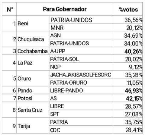 En primera vuelta sólo fueron elegidos los Gobernadores de los departamentos de Cochabamba (aunque el viernes en la tarde aún estaba el recuento en 96,11 %, la diferencia de A-UPP con su siguiente era de más de diez puntos, lo que lo constituía ganador legal), Pando (LIBRE-PANDO) y Potosí (AS, resucitando luego de cerca de dos décadas), siendo estos tres los únicos en los cuales el Gobernador elegido podrá contar con una mayoría posible de Asambleístas Departamentales (como éstos se eligen en primera vuelta, en el resto de los departamentos las alícuotas de los que van a segunda vuelta rondan entre un máximo del 36,56 % en Beni para PATRIA-UNIDOS y un mínimo del 9,12 % de NGP en La Paz). Para los otros seis departamentos, la primera vuelta dejaba cinco opciones posibles para PATRIA (Beni, Chuquisaca, La Paz, Oruro y Tarija) y dos espacios para LIBRE (Pando ya asegurado y posible Santa Cruz); pero la confrontación más cerrada quedaba en Santa Cruz con 1,49 % de diferencia entre LIBRE y SPT al 89,34 % de avance de actas computadas. (La confrontación en Santa Cruz es un fenómeno político interesante: dos candidatos ubicados ambos en sectores de derecha-centroderecha, uno joven y nuevo en política —recién surgido en las nacionales de 2025 como segundo de lista— y otro adulto mayor, habituado en ellas y que lleva al partido que siempre militó —la Falange Socialista Boliviana, mezcla de falangismo español, antimarxismo, nacionalismo y un poco de Doctrina Social de la Iglesia— a su mejores resultados y primera posible victoria desde su fundación por Unzuaga de la Vega en 1937).