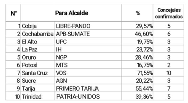 Otro caso son las Alcaldías, cuyos ganadores son elegidos en primera vuelta, y cuyo espacio de victoria va desde el 71,55 % de Manuel Saavedra con VOS en Santa Cruz de la Sierra (superior a cualquier otra elección en Bolivia, incluidas las votaciones por el legendario Percy Fernández) hasta el pírrico el 16,75 % de MTS en Potosí, aunque en miembros de los Concejos Municipales a varios los beneficia la distribución d’Hondt que emplea el sistema electoral boliviano; así aseguraron su gobernabilidad VOS que tiene 10 concejales de 11 posibles (una mayoría más que absoluta que le permitirá desarrollar su programa y promesas), PRIMERO TARIJA con siete y APB-SÚMATE (Cochabamba) con seis, quedando por debajo de esas cifras LIBRE-PANDO y PATRIA-UNIDOS (éste en Tarija), ambos con cinco concejales, mientras que en El Alto, La Paz, Oruro y Sucre los Alcaldes electos sólo serán acompañados por tres concejales (UPC, IH, NGP y AGN, respectivamente); menos gobernable aun queda la ciudad de Potosí en la que el ganador, MTS, sólo obtuvo dos concejales.