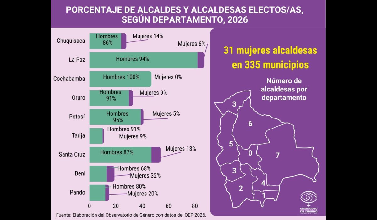 De acuerdo con el análisis del Observatorio de Género de la Coordinadora de la Mujer, con base en los datos del cómputo oficial del Órgano Electoral Plurinacional (OEP), del total de los alcaldes electos, solo el 9,7% es mujer.