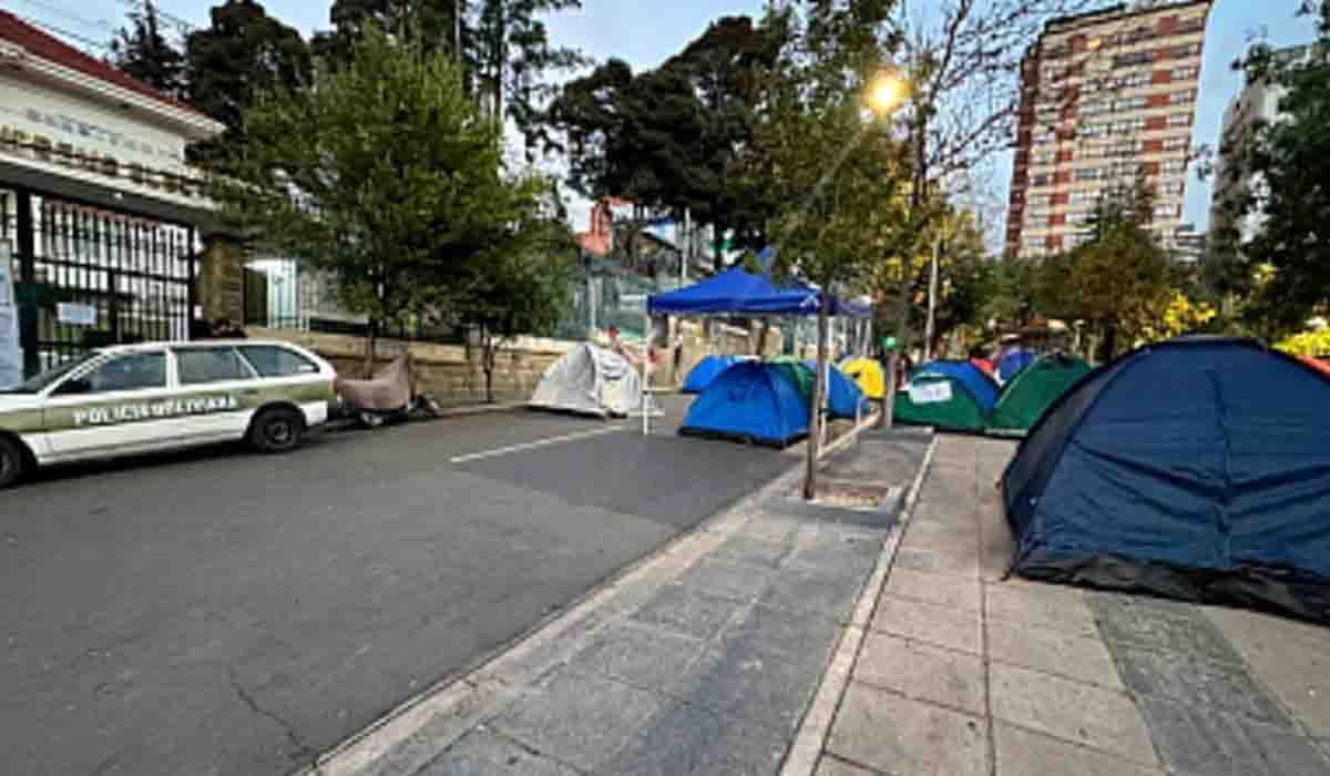 La mañana de este lunes, la plaza Eduardo Abaroa amaneció bloqueada por parte de simpatizantes de René Yahuasi, candidato a la Gobernación de La Paz, que exige ser incluido en la segunda vuelta electoral. Sus seguidores pasaron la noche en carpas frente al Tribunal Supremo Electoral (TSE).