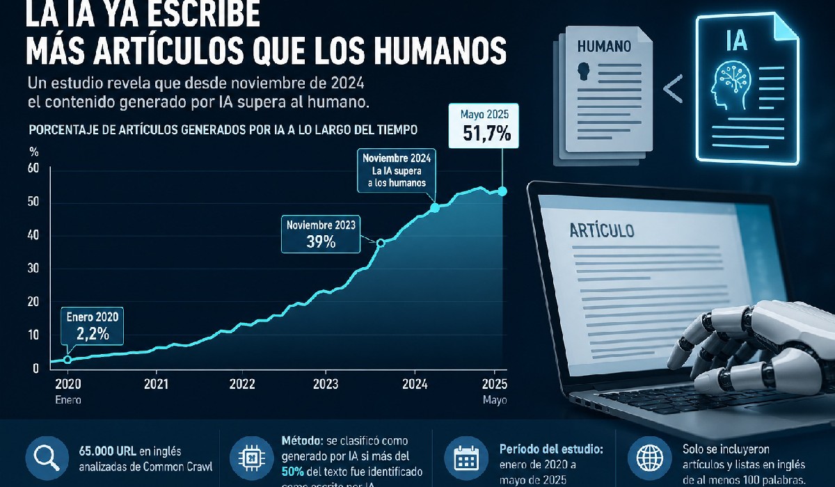 La producción de artículos generados por inteligencia artificial ha superado por primera vez a la creada por humanos, según un estudio reciente que analiza la evolución del contenido digital entre 2020 y 2025. El informe señala que este cambio se consolidó en noviembre de 2024, marcando un hito en la historia de la publicación en internet.