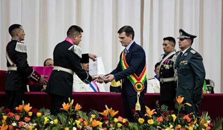 En el acto de egreso de los nuevos oficiales, el mandatario compartió la testera con el vicepresidente, Edmand Lara, quien utilizó el uniforme policial.