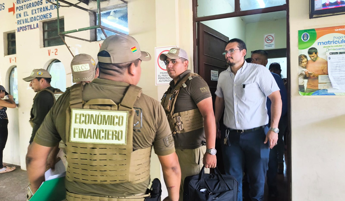 Agentes de la Unidad de Patrimoniales de la Fuerza Especial de Lucha contra el Crimen (FELCC) realizaron la inspección en el área de Títulos de la universidad estatal cruceña. El asesor legal de la institución, Dorian Coca, enfatizó que la UAGRM se ha constituido en parte querellante del proceso. Similar acción se realizó en la Quinta Municipal.