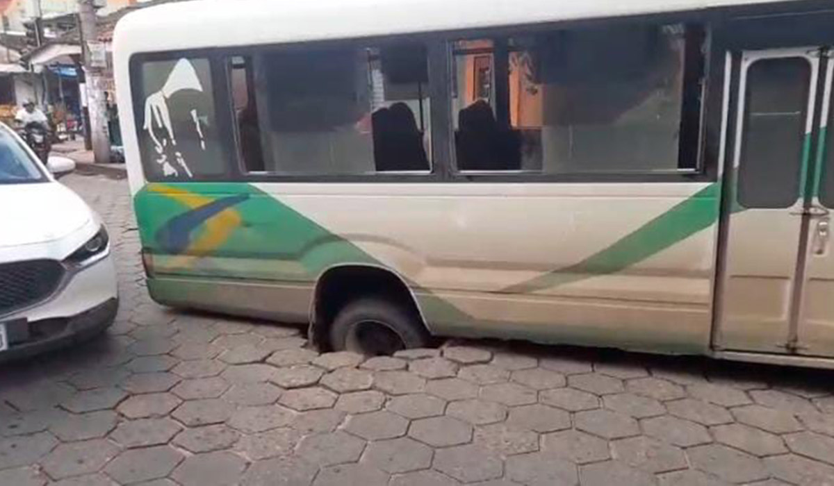 Las imágenes registradas por Luis Domingo, autorizadas para su difusión en redes digitales, muestran el momento en que una de las llantas del micro quedó atrapada entre las losetas.