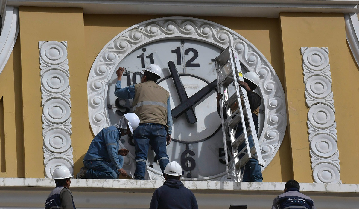 A dos días de la posesión del nuevo Gobierno, las alcaldías de El Alto y La Paz trabajan en refaccionar ambas urbes para recibir a las autoridades y a los invitados internacionales. Una de estas labores es restaurar el reloj del Palacio Legislativo, cuyas manecillas giraban en sentido contrario al habitual desde que fue modificado hace 11 años por el ahora vicepresidente saliente, David Choquehuanca.