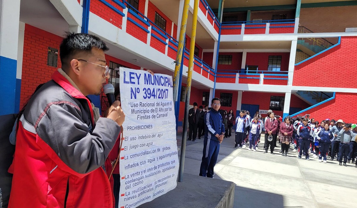 La Paz, 10 de febrero de 2026 (ABI). – Con una campaña de socialización y concienciación, la Unidad de Prevención y Calidad Ambiental de la Alcaldía de El Alto capacita a estudiantes sobre el cuidado y uso racional del agua en el marco del Plan Carnavales 2026.