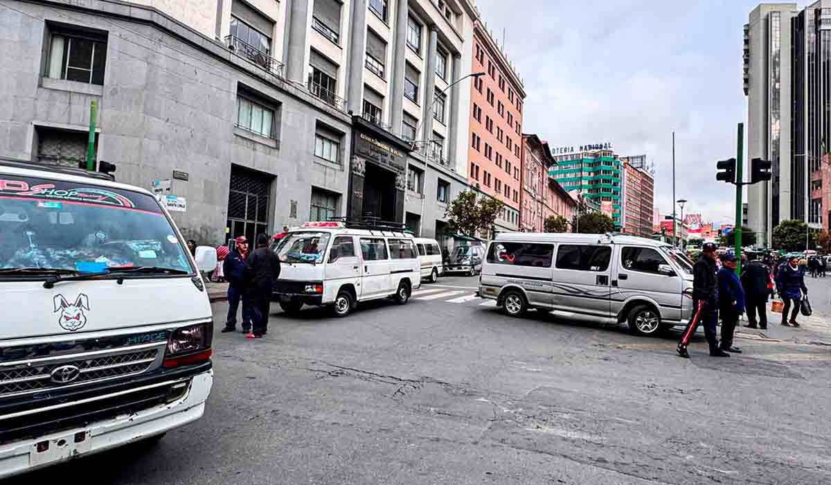 Choferes del transporte libre bloquean la mañana de este lunes la avenida Mariscal Santa Cruz, a la altura de la calle Oruro, frente al Palacio de Comunicaciones, en demanda de que el gobierno atienda sus reclamos por la calidad de la gasolina que, según denuncian, afectó los motores de sus vehículos.