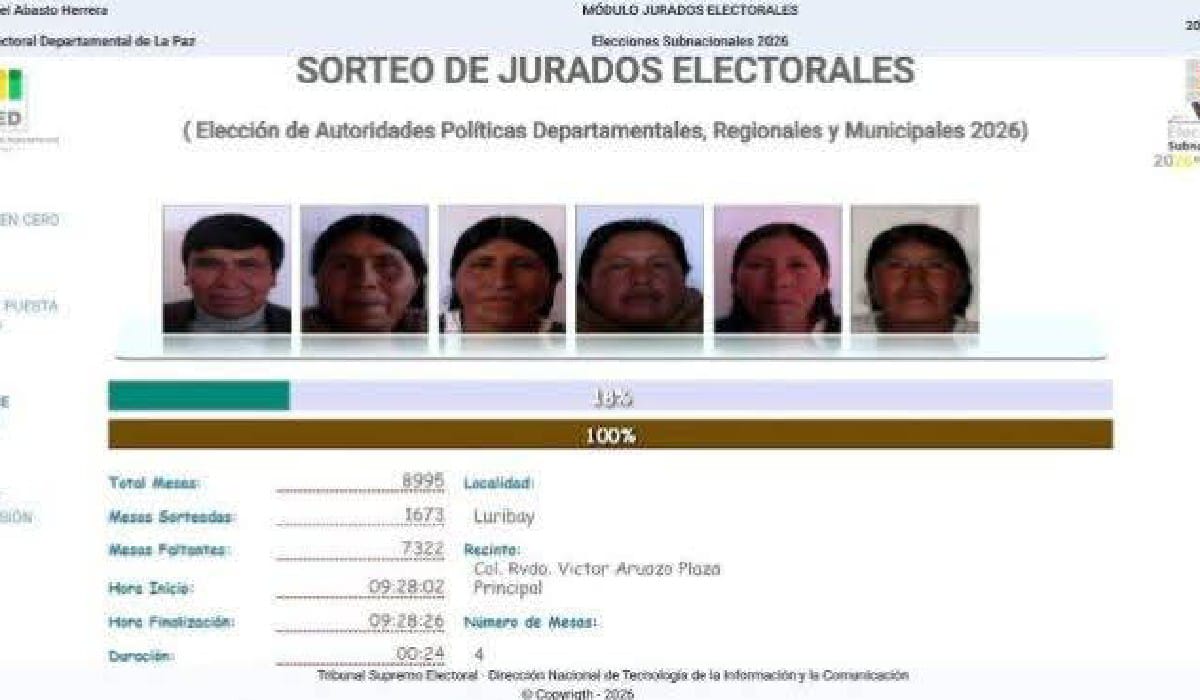 El pasado viernes 20 de febrero se realizó el sorteo público de jurados electorales a nivel nacional, organizado por los tribunales electorales departamentales. Según datos del TSE, la distribución de jurados por departamento es la siguiente: Chuquisaca, 10.548; La Paz, 53.970; Cochabamba, 37.164; Oruro, 10.074; Potosí, 14.040; Tarija, 10.596; Santa Cruz, 53.772; Beni, 8.082; y Pando, 2.388 ciudadanos.