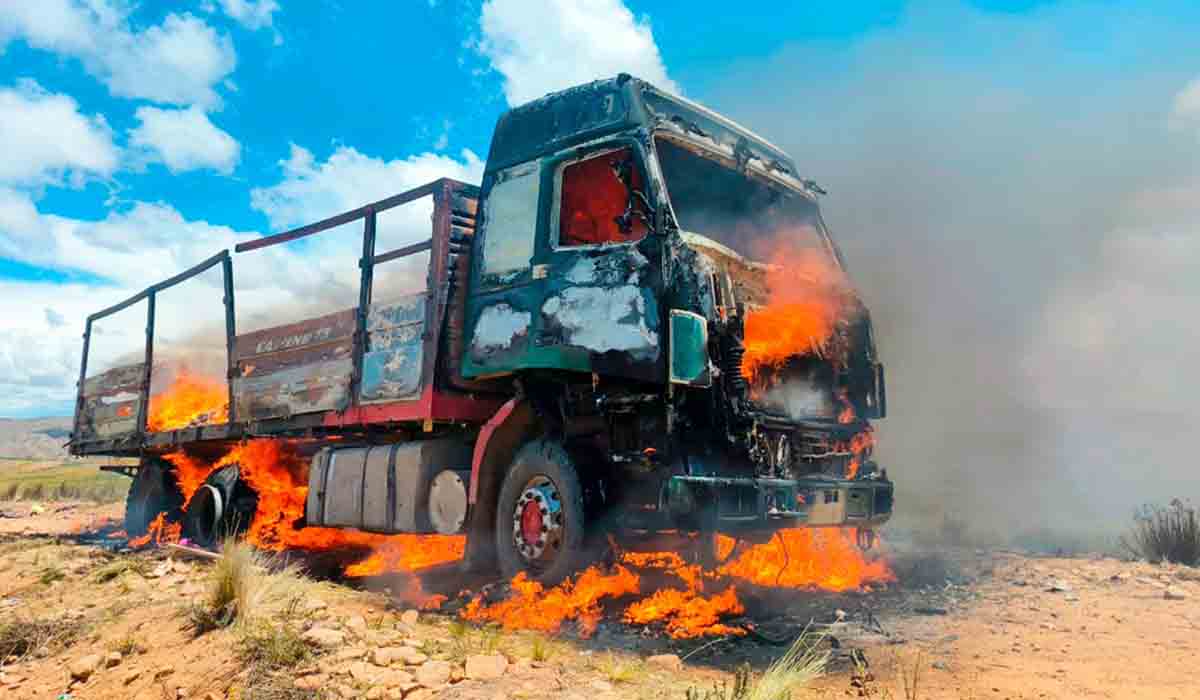 El Grupo de Reacción Inmediata Aduanera (GRIA), con el apoyo de efectivos militares, incineró un camión cargado con fardos de ropa usada de contrabando en la comunidad de Chocorosi, municipio de Calamarca, departamento de La Paz.